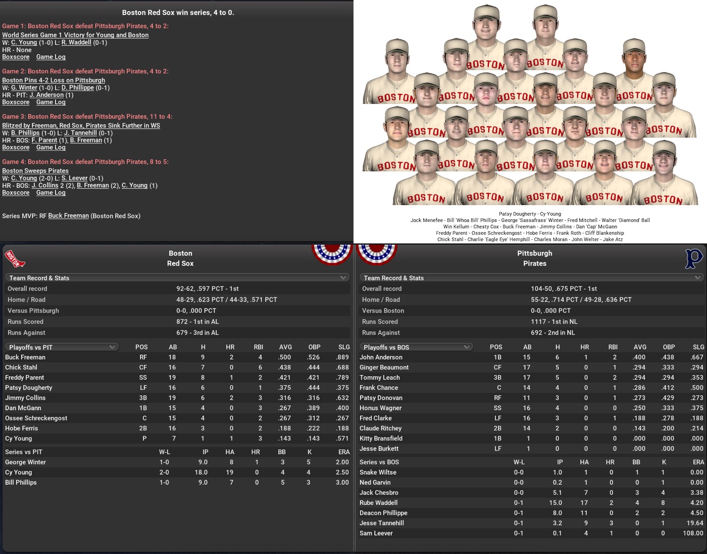 Cy Young outduels Rube Waddell 4-2 in the opener and the Red Sox are never headed in a comfortable sweep of a very disappointing Pirates outfit.