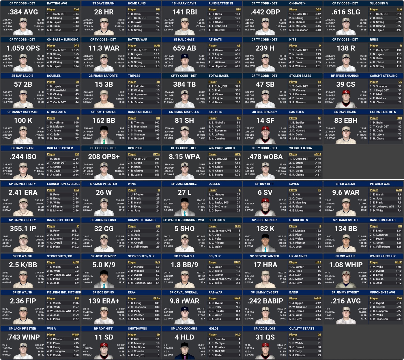 Walter Ball and Rube Foster lock down 20 or more Wins again this season and special mentions to Johnny Taylor and Jose Mendez for toiling away under tough conditions with Losses aplenty. Jose Munoz knows more than anyone how they feel, going 13-26 to leave his career mark at 53-99.