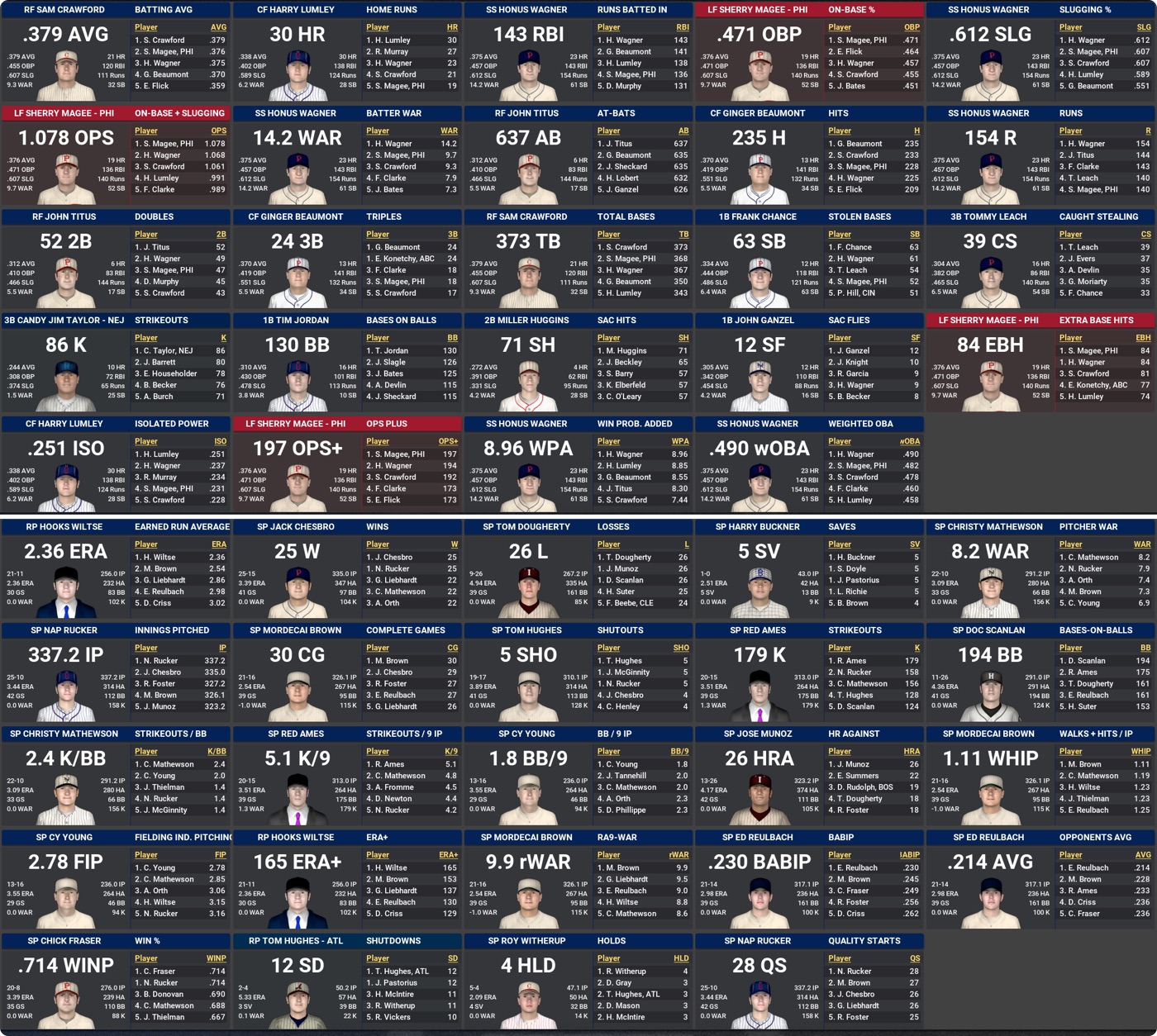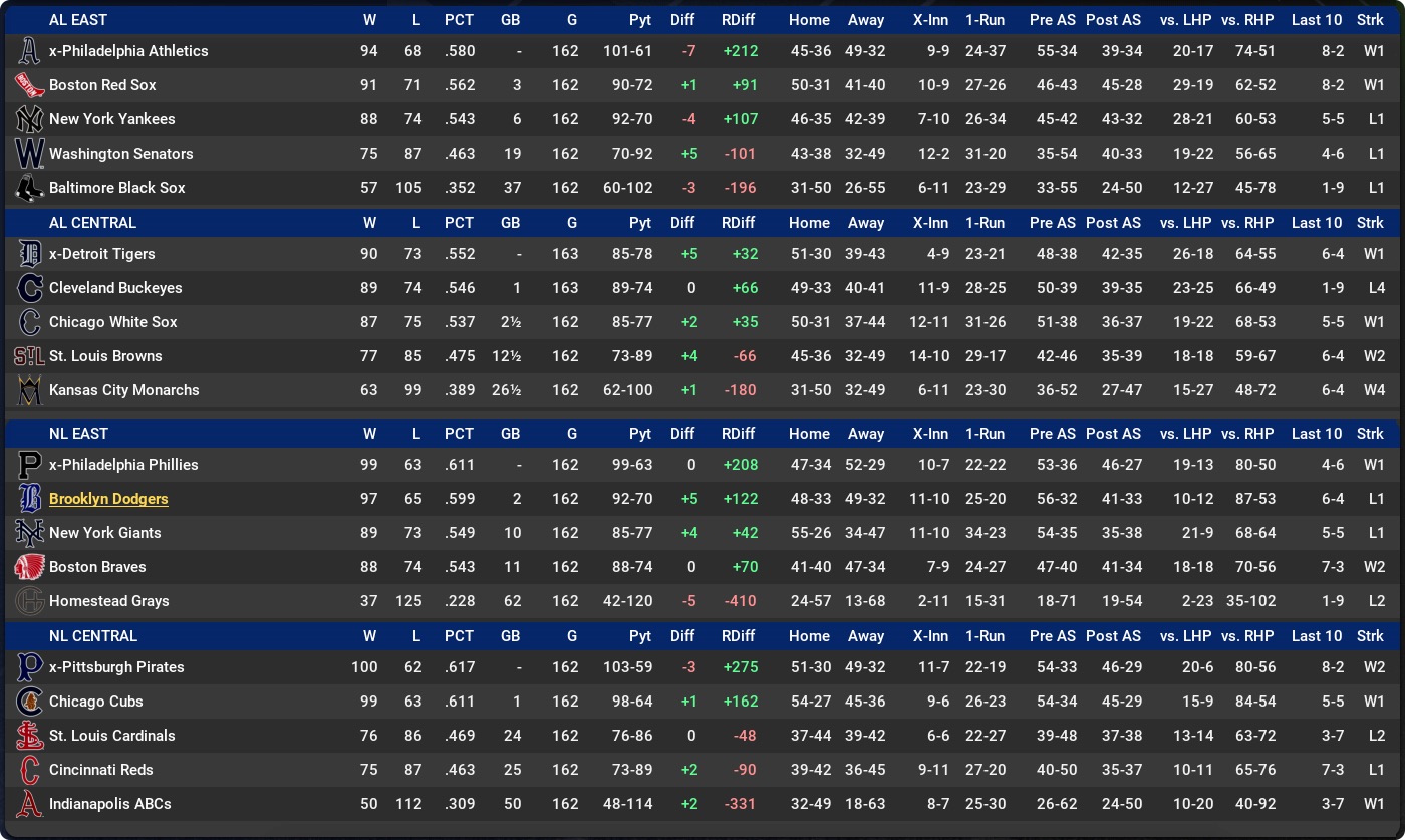 My Dodgers fly out of the blocks to be 52-30 and on top of the NL East entering July but then suffer one of the most unbelievable runs of injuries – including career-enders for both Harry Howell and Bill Donovan – and get run down by the Phillies, who time their run perfectly with an 11-game win streak. Even then, they need 99 Wins to get past us by two.