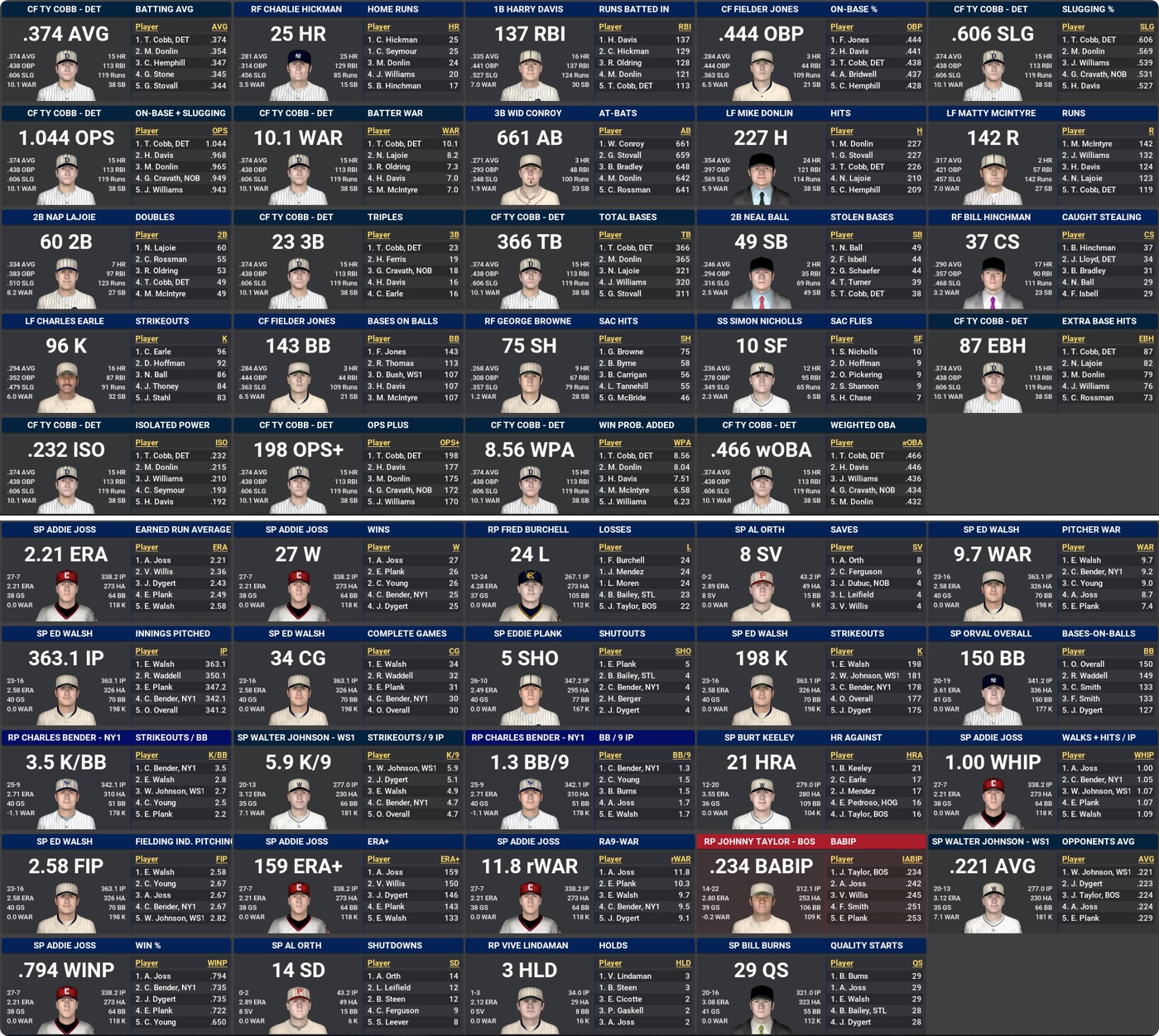 Once again, Ty Cobb and Honus Wagner win unanimous MVPs, with Mordecai Brown doing likewise for the NL CYA and Addie Joss winning his first.