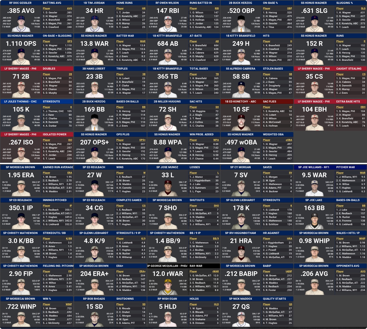 A few new single-season marks set: Buck Herzog 169 BB; Jules Thomas 105 K; Mordecai Brown 0.98 WHIP.
