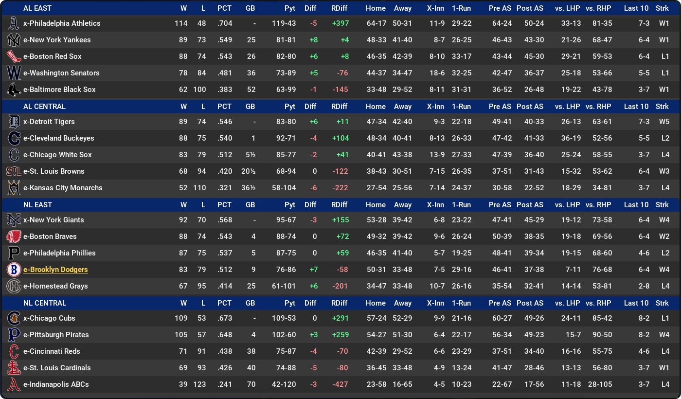 • NL East: 95-67 Giants 3 clear of the Phillies, with the 75-87 Grays and Dodgers in the cellar.
