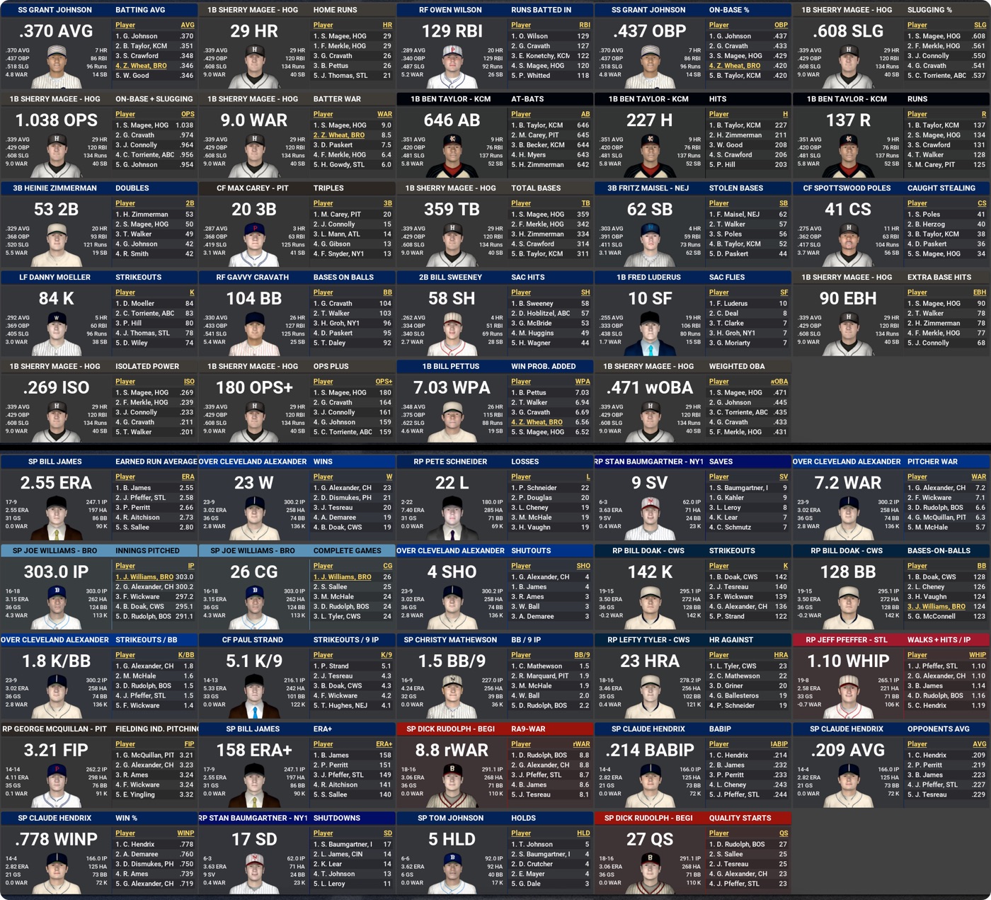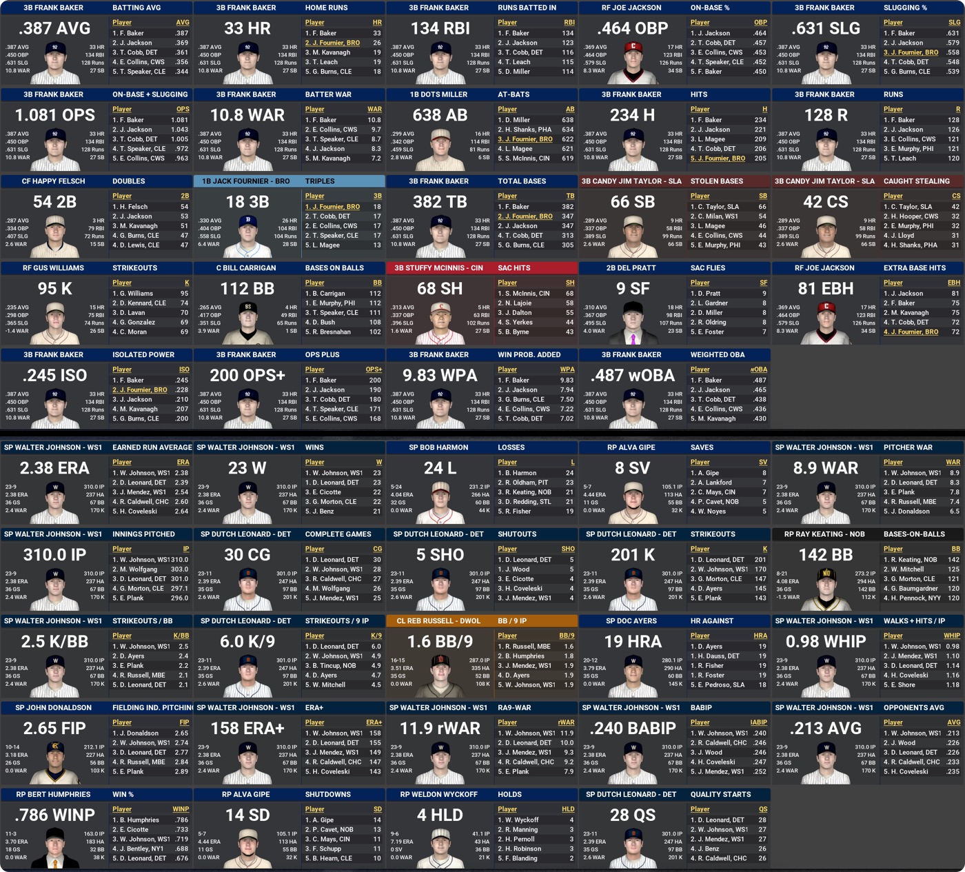 Frank Baker repeats as AL MVP, although surprisingly not unanimously. Sherry Magee wins in the NL, with him along with CYA winners Dutch Leonard and Pete Alexander all first-time winners.