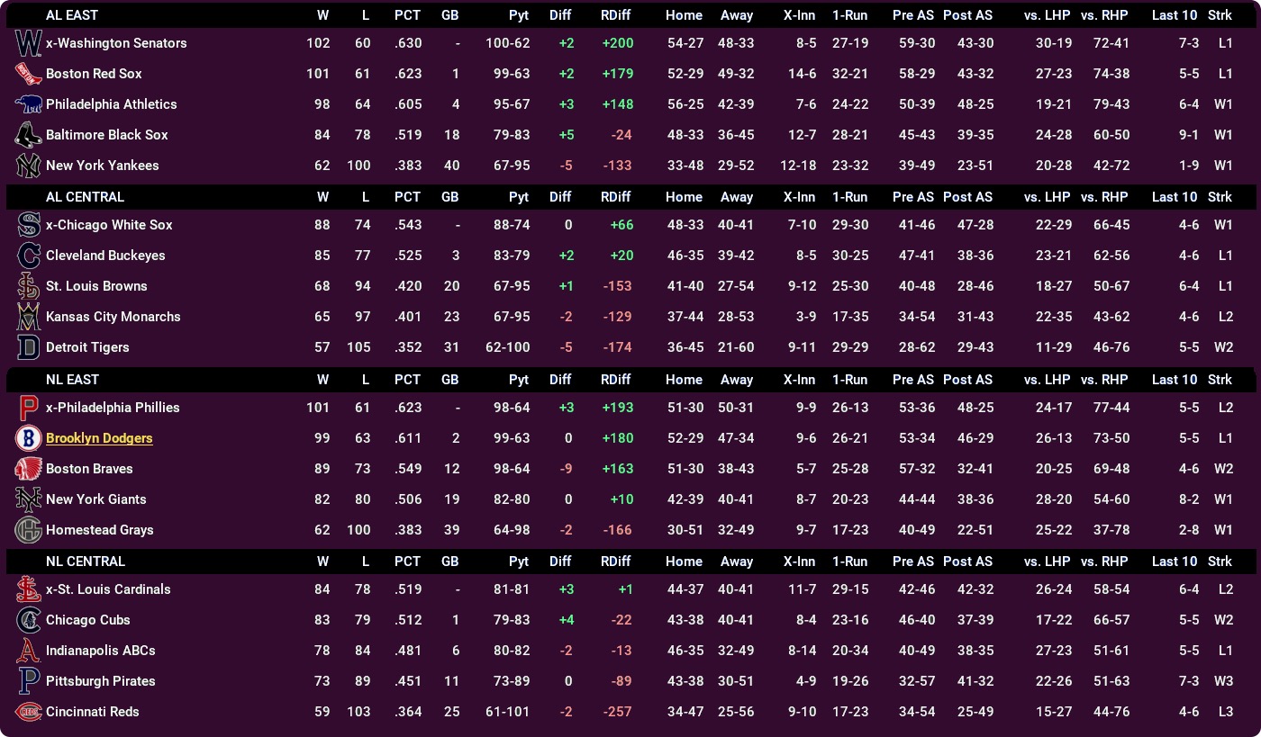 • NL East: 103-59 Giants 13 clear of the Dodgers, with the 64-98 Grays in the cellar.