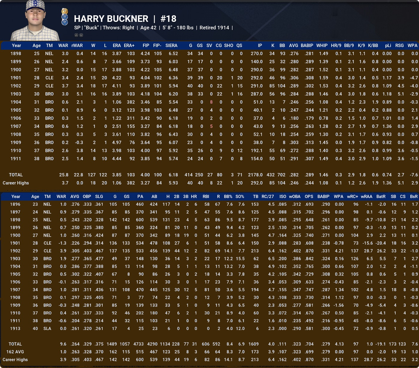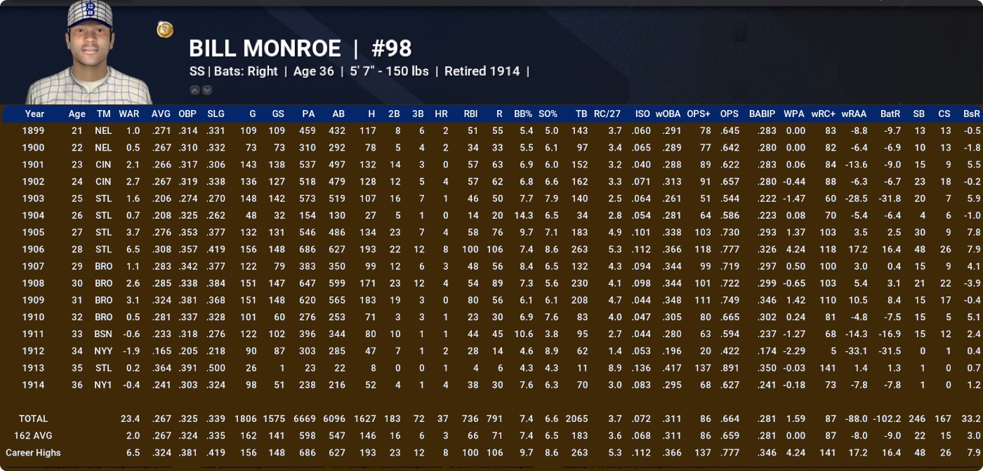 BILL MONROE: Bit of a glove-heavy deadball type on paper, but did OK with a career slash of 267/325/339 and more than 20 WAR all told. Also recorded nearly 40 career ZR at his preferred SS and 3B.