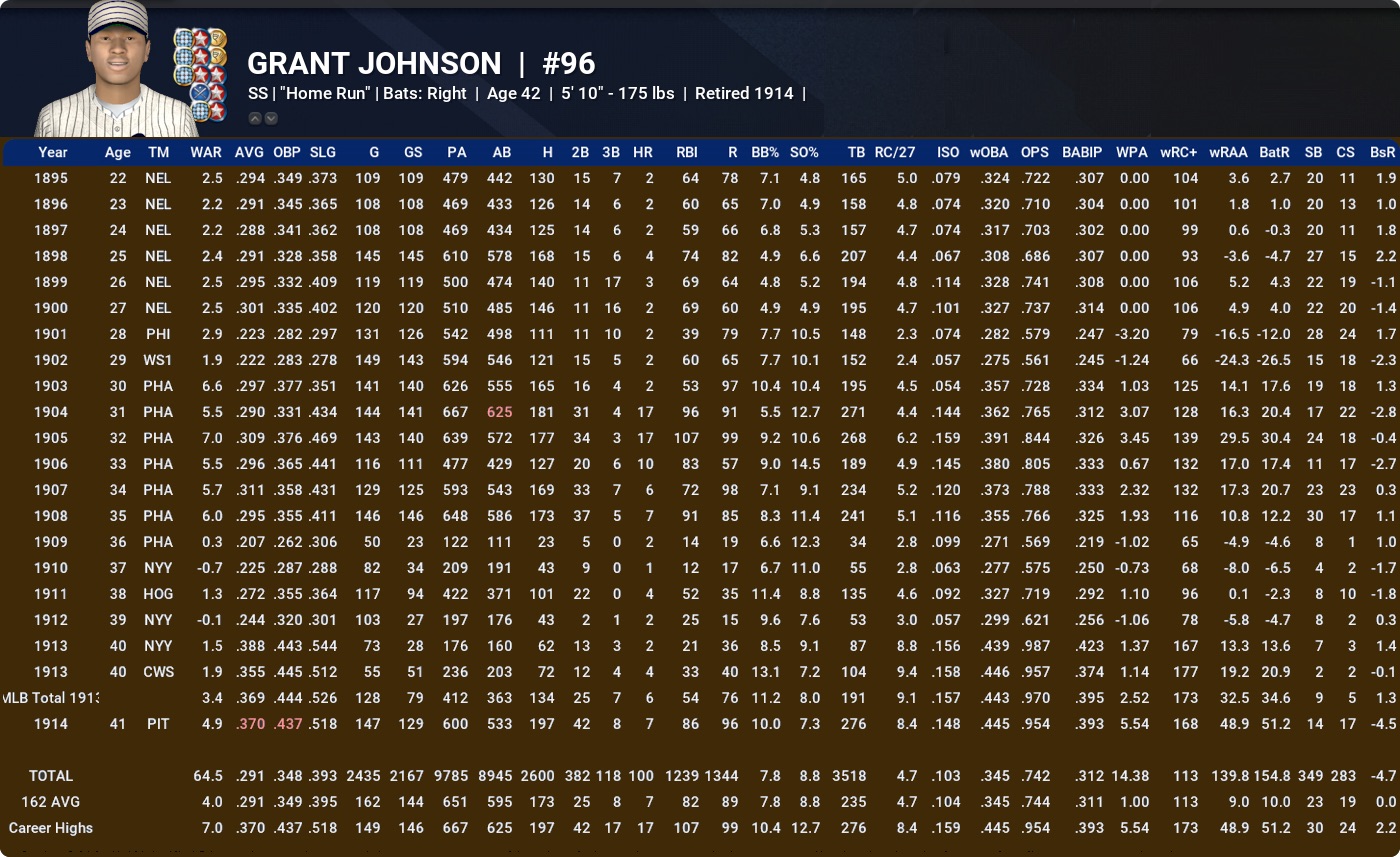 In the final season of his illustrious career, Grant Johnson hits .370, drives in 86 and collects nearly 5 WAR. In his final game, he has 4 hits and 4 RBI and – with 2600 Hits on the button – he may well end up being this group’s first Hall of Fame representative.