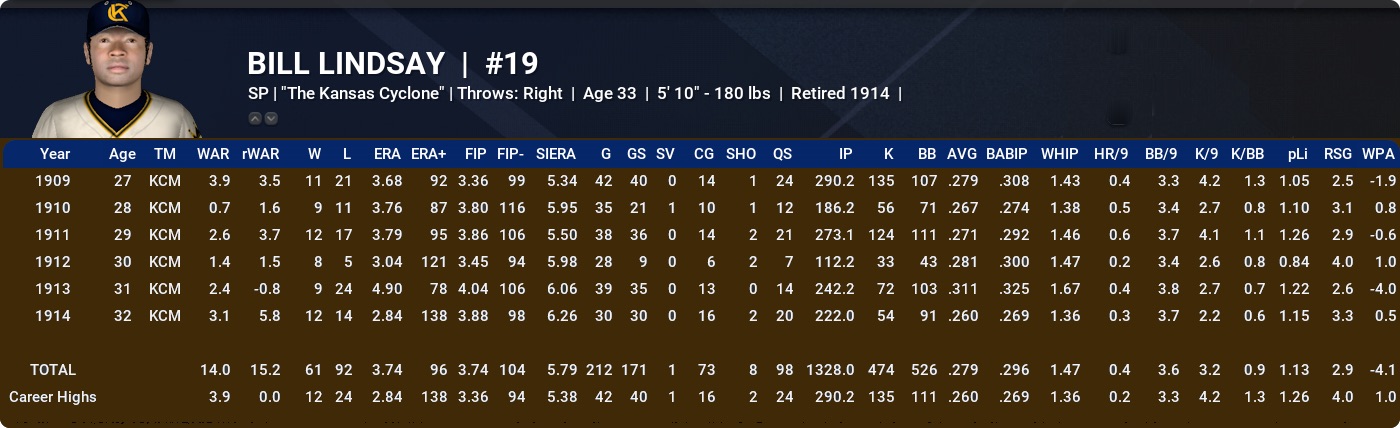 BILL LINDSAY: Another relatively short career but Bill hasn’t disgraced himself with nearly 15 WAR. His club alignment, as will be the case with many of these guys, has left him with a rough 61-92 record.