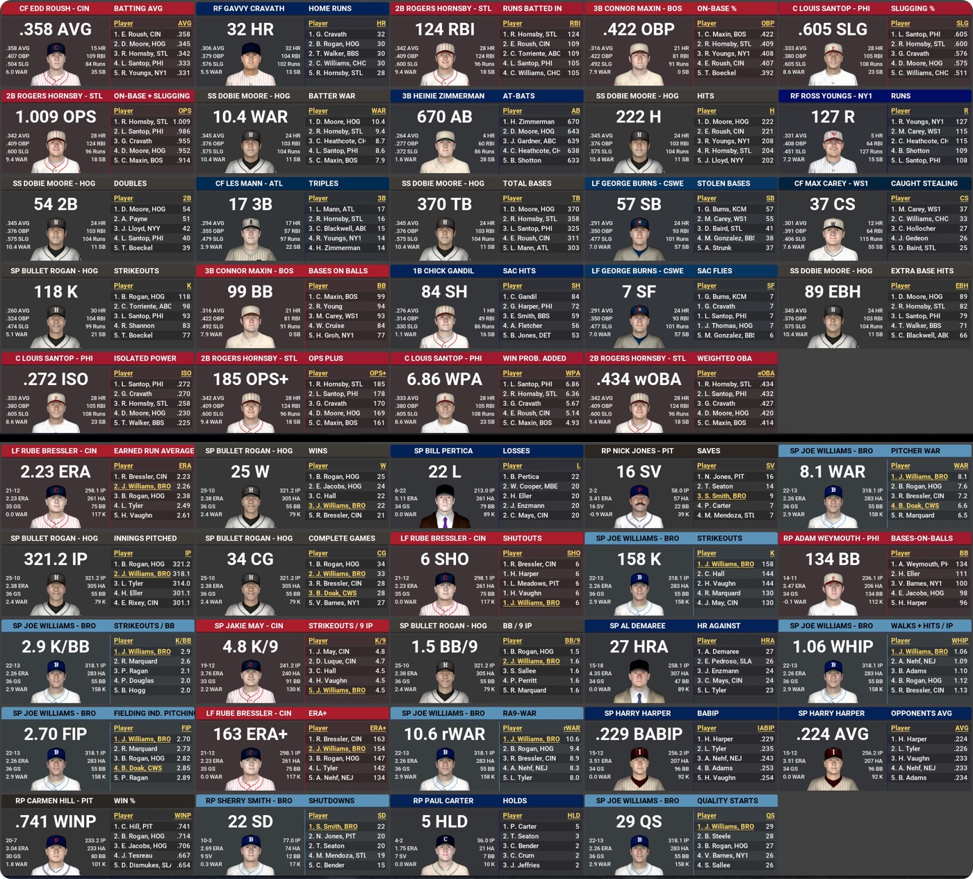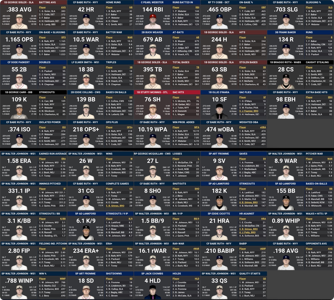 The Babe and Bullet each win his first MVP. Walter Johnson wins his fifth CYA, Smoky Joe Williams his first.