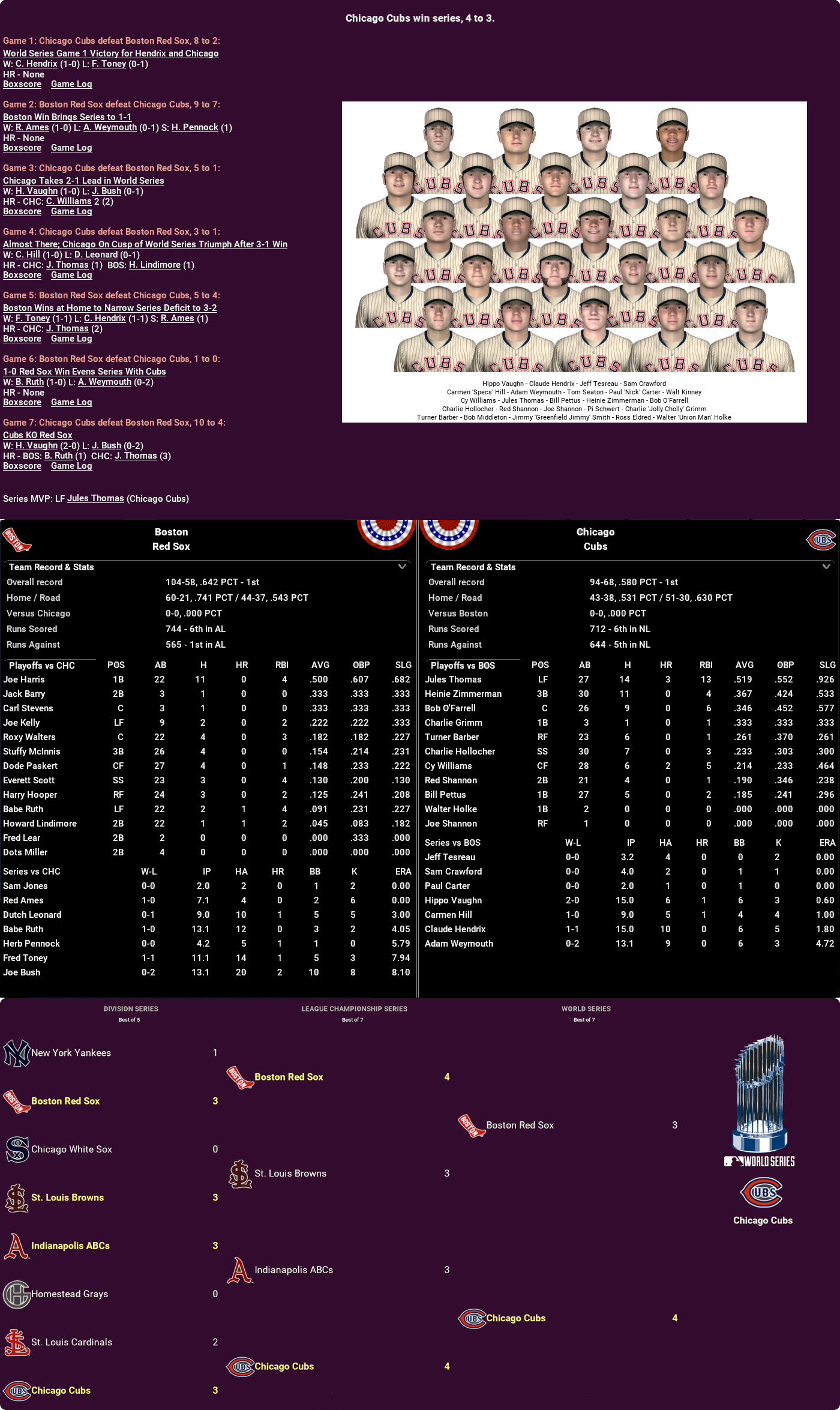 To think we were only a few runs away from a repeat of last year’s World Series. Instead, we get a heavyweight belt contest between two (along with the Athletics) of the most successful clubs in this timeline, who after this one is sorted out will between the three of them have won 12 of the 18 championships decided so far. A Red Sox win here will see them move into outright first with five titles, matching their IRL total over the same period, while a Cubs win would pull them into a tie with the other two on four. Plenty at stake, in other words.