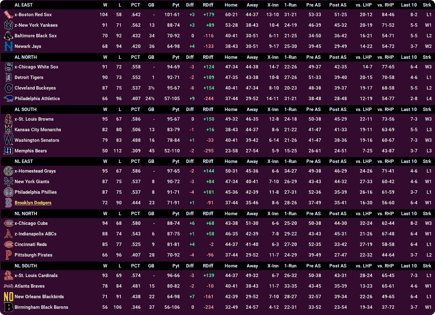- NL East: 93-69 Grays 3 clear of the Phillies, with the 85-77 Dodgers in the cellar.