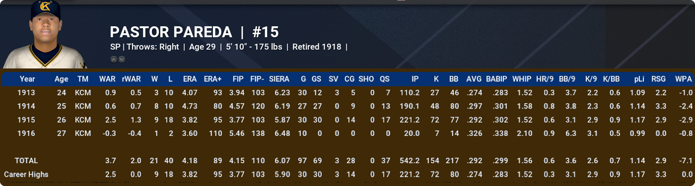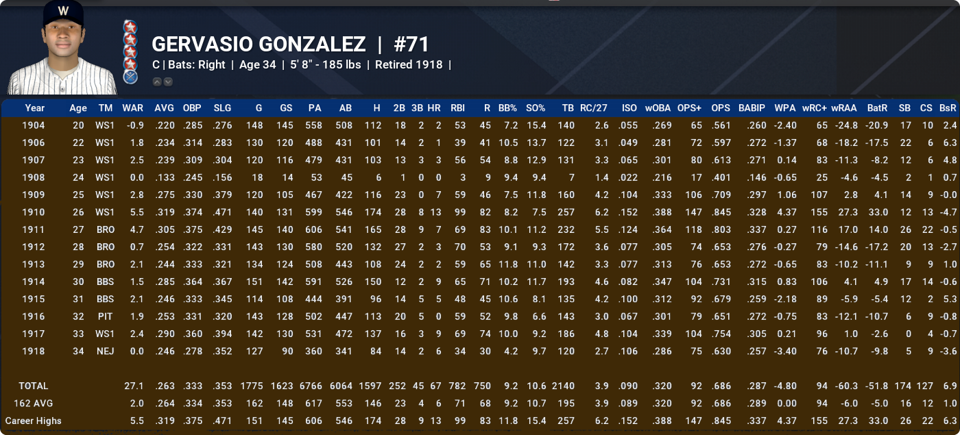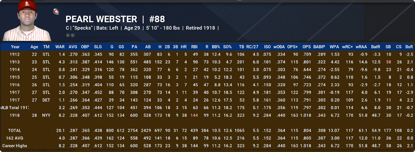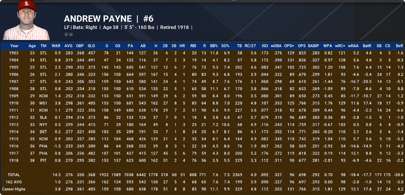 ALFREDO CABRERA: Even though we need to scale it back a wee bit because of the slightly juiced environment, it’s a testament to what a good job the lads have done with this mod that pre-1920 contact / smallball guys like Alfredo are having nice little careers in this timeline. They rightly get some WAR help from their secondaries (Alfredo’s career ZR was 144) but, all the same, what we are seeing here is excellent compared to how the unmodded versions of the NeL players from this era fare. A little ironically given the club’s historical aversion to diversity, was a member of the Red Sox’s 1911 Championship team in this timeline.