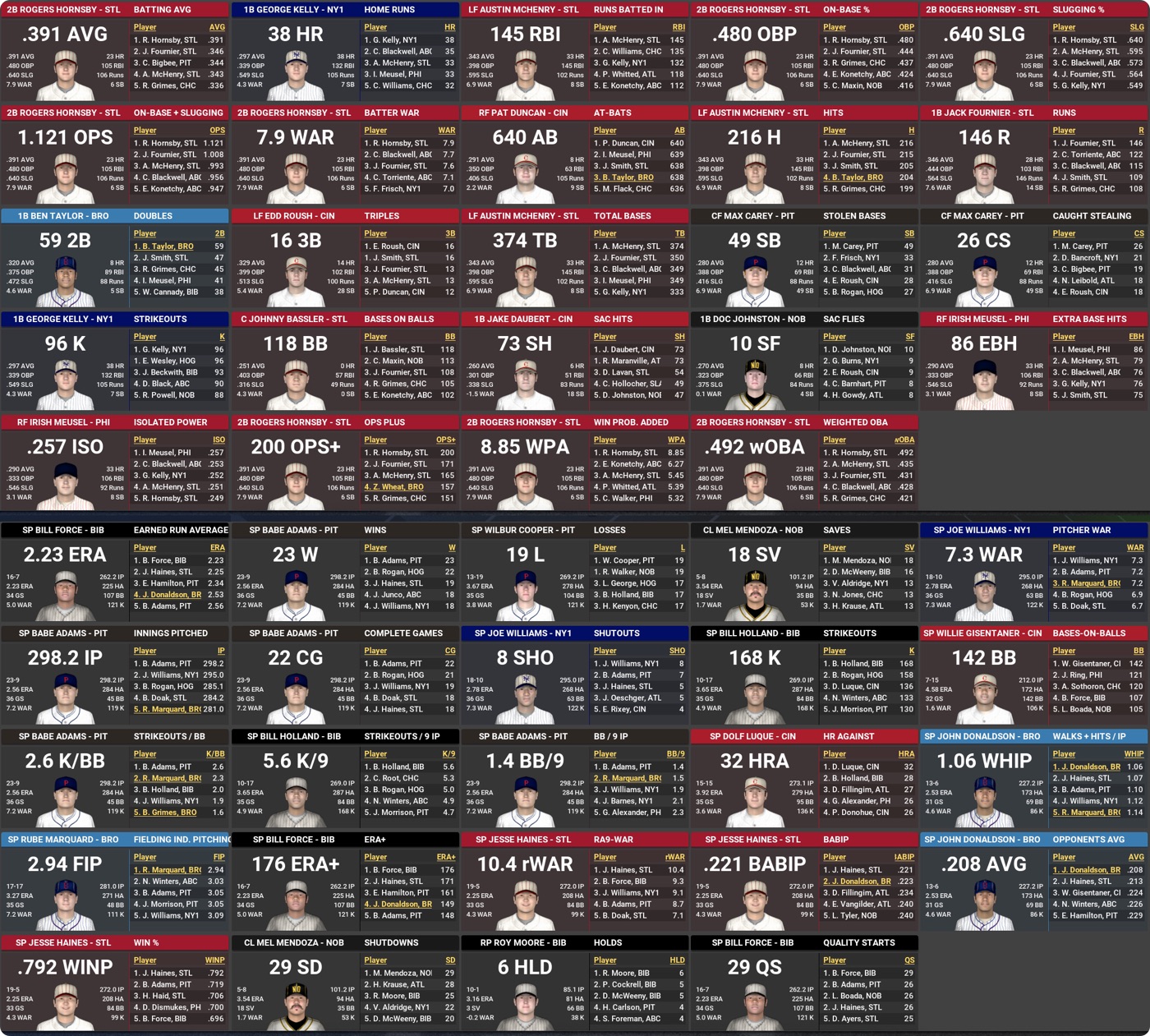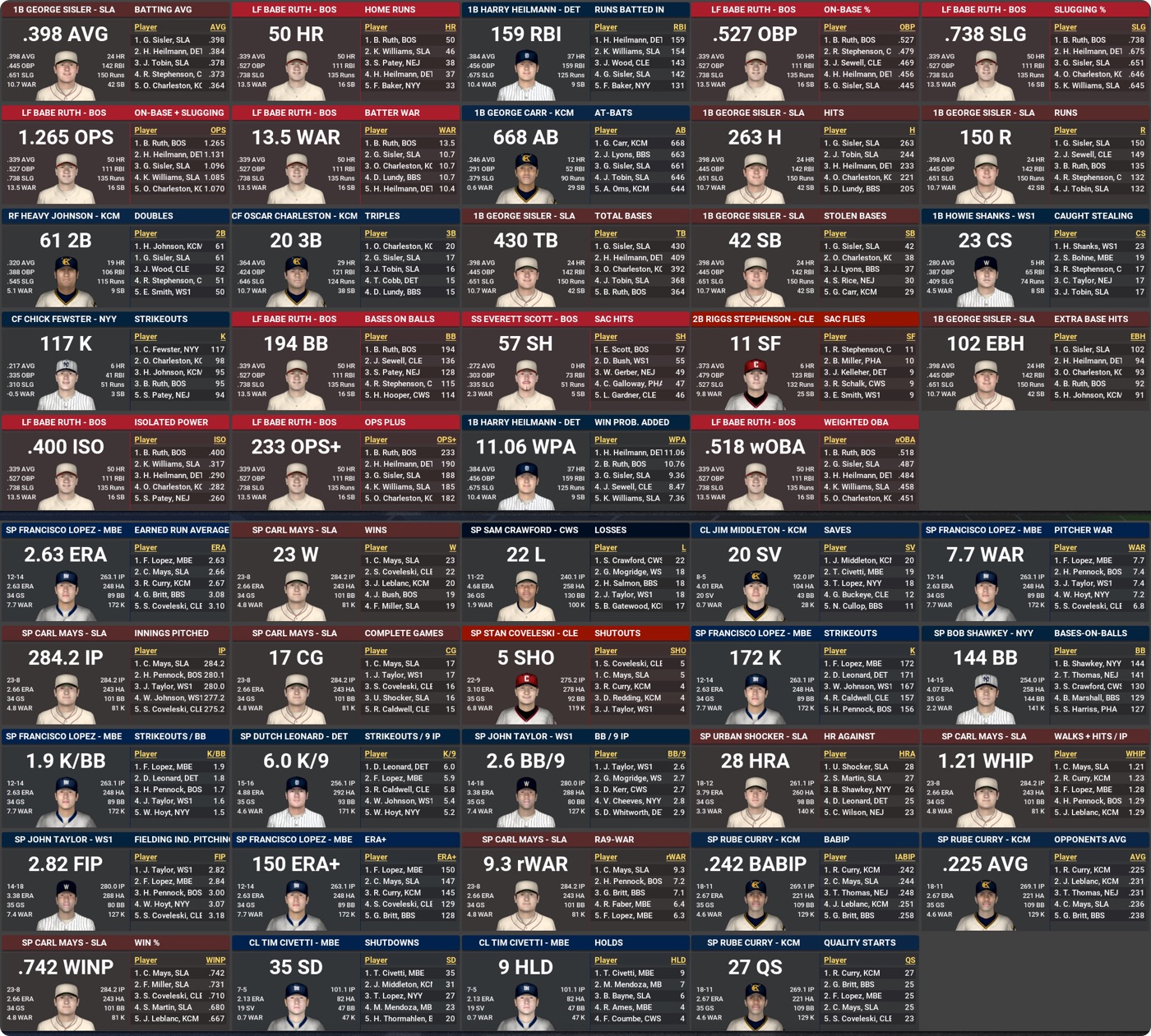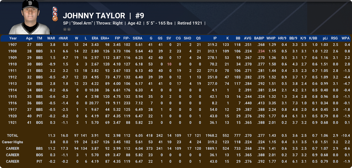 Mainly on the pitching side again, 1921 also get some excellent performances from the non-modded crew. Bill Force’s 9.3 rWAR and MLB-low 2.23 ERA should make him a virtual lock for the NL RoY and earn him some down-ballot love in the CYA as well. George Britt, Lucas Boada, Jose Leblanc, and John Taylor also do very nicely for themselves.