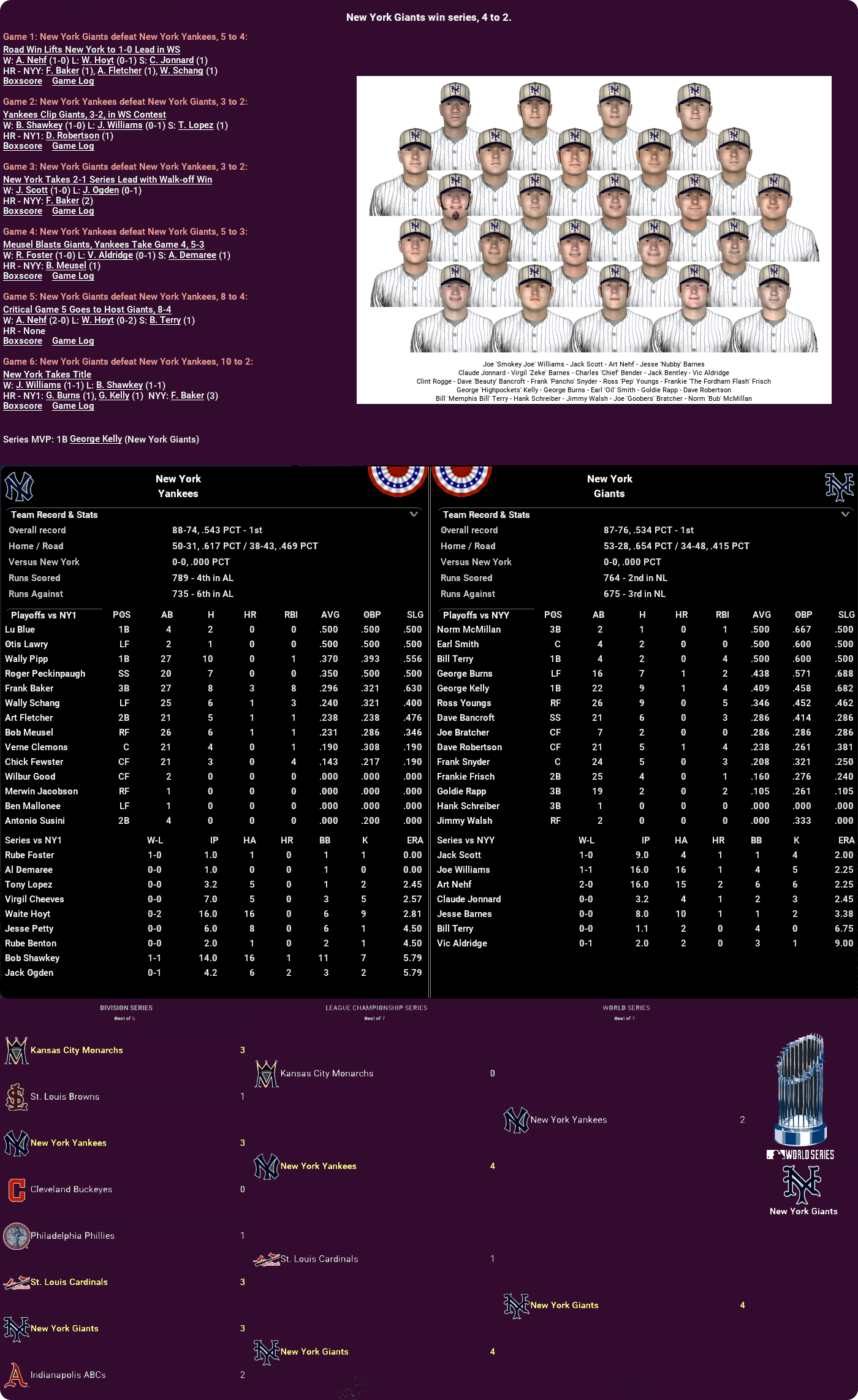 The Giants destroy the Cardinals 8-0 in the opener, with Art Nehf hurling a 3-hitter, but the Cards steady to even the series with a 4-2 victory. Once again, the Giants blow them out 10-2 in St. Louis a couple days later as Joe Williams goes the distance and another comfortable win in G4 puts them on the cusp of that long-awaited WS berth and the Cards finish off a dreadful series with the worst of the lot, a 14-2 capitulation that gives us our first-ever Subway Series in this timeline!