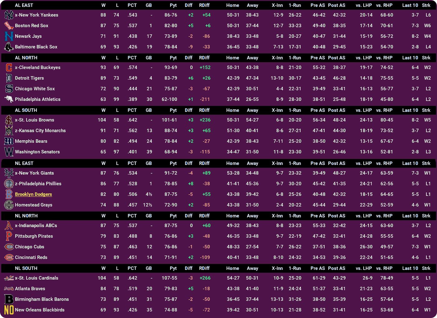 The Browns look set to run away with the AL South once again but – just like the Buckeyes – lose their way a bit in the middle section and then the Monarchs make it even more interesting with a 22-7 August including 12 straight wins, putting them within striking distance. They get as close as six before the Browns steady and go on to make it four straight division titles.