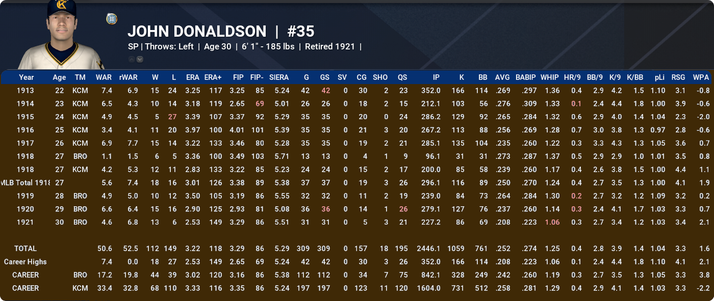 JOHN DONALDSON: A tricky one to cater for, as his IRL career stopped and started and he barnstormed for years. Still, his modded avatar did well over a relatively short career in this timeline, nudging past 50 rWAR with a fine farewell season at our club.