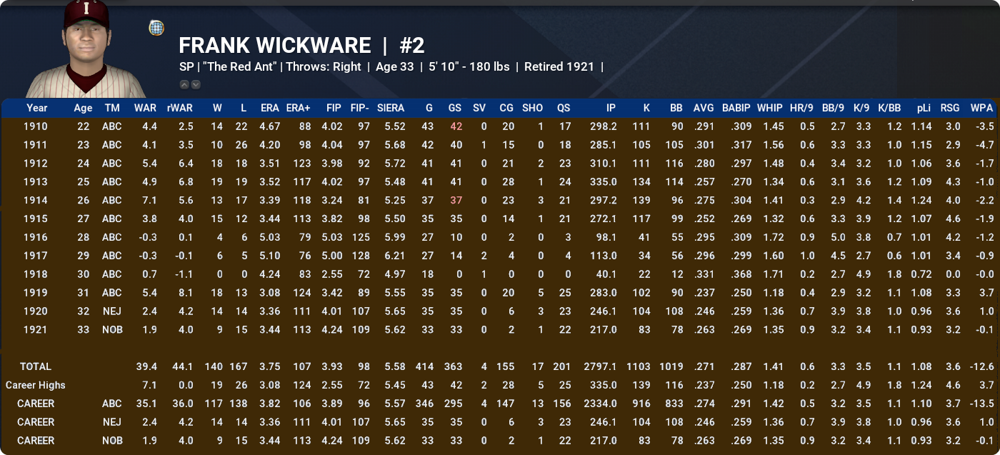 FRANK WICKWARE: The man known as the “Red Ant” spent almost his entire career in this timeline with the ABCs, and was a member of their famous 1917 Championship squad. Turned out to be pretty handy, with 140 Wins and close to 40 rWAR all told.